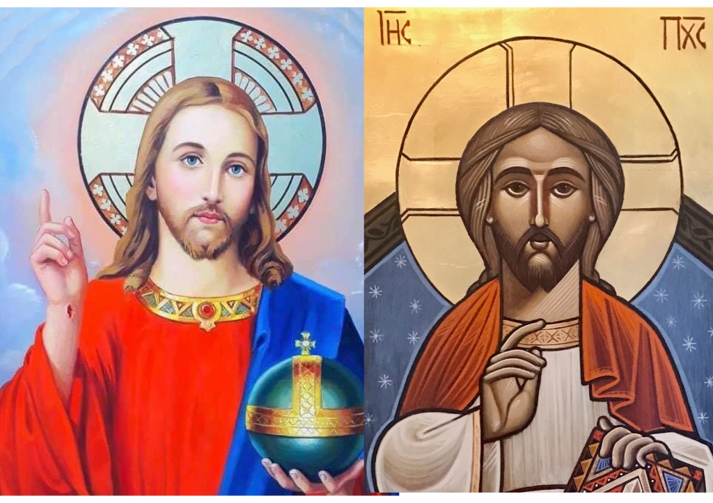 A Roman “religious kitsch” style painting of Jesus with blond hair and blue eyes holding a globe juxtaposed with a Neo-Coptic (Fanoussian) icon of Christ.