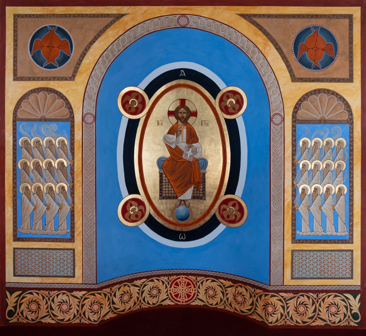 The brief for this project was to create a design of Christ Enthroned surrounded by the Four Creatures in the central apse, flanked by 12 Elders of Revelation on each of the side walls, in a kind of giant triptych. The overall painted surface represented roughly 30 M2. The apse was executed in the traditional technique of egg tempera and took 6 weeks to complete.